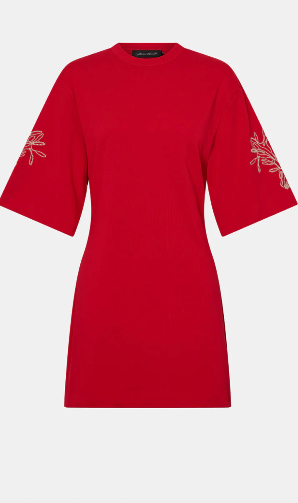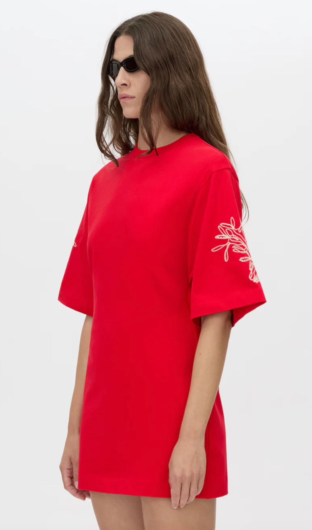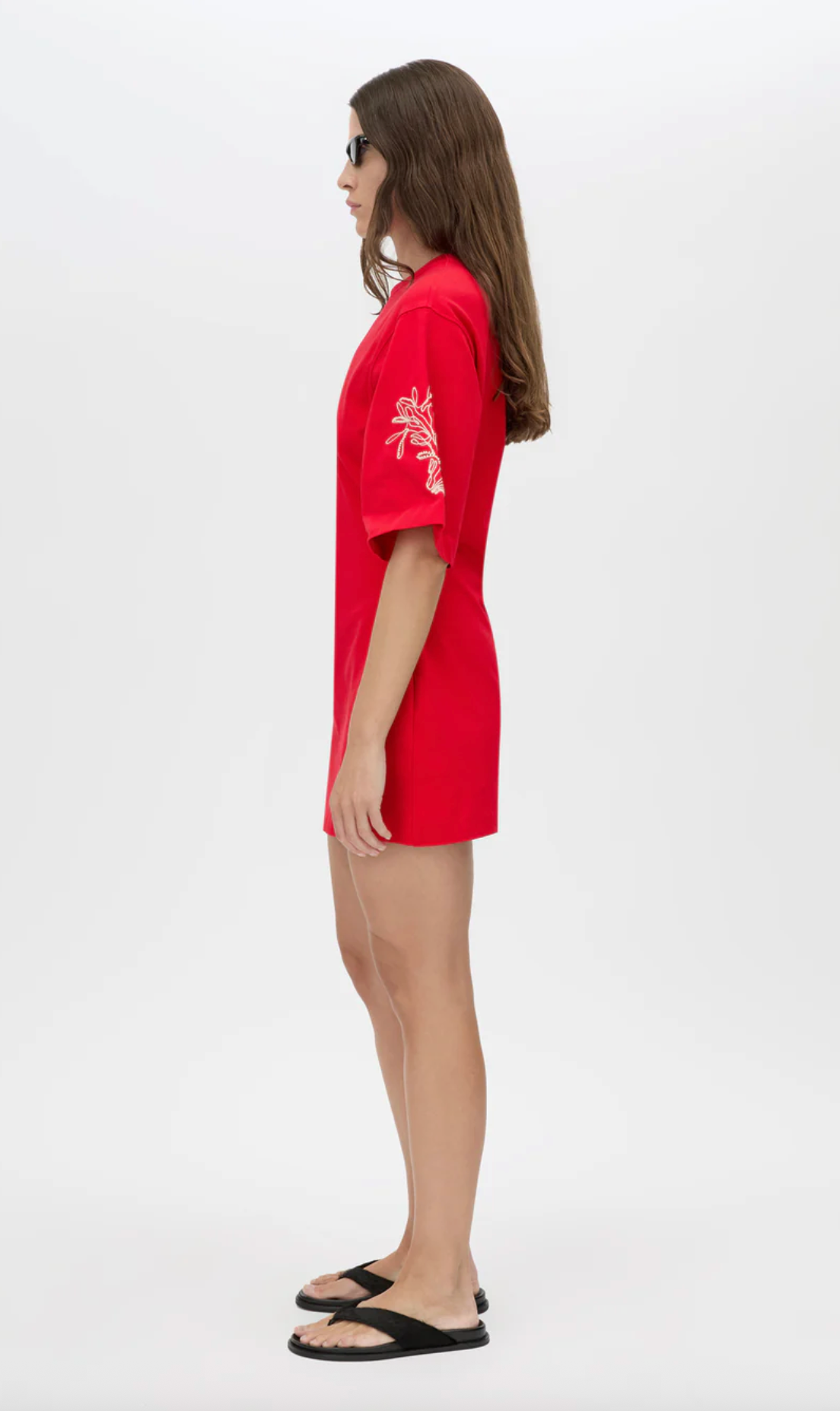CAMILLA AND MARC Eviva mini dress in poppy red with beaded chainstitch embroidery. Strong shoulder, straddle stitch details, blind hem. Atelier Notes: 100% cotton. - True to size- Model is...