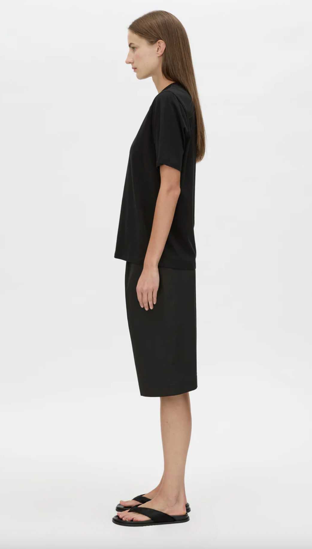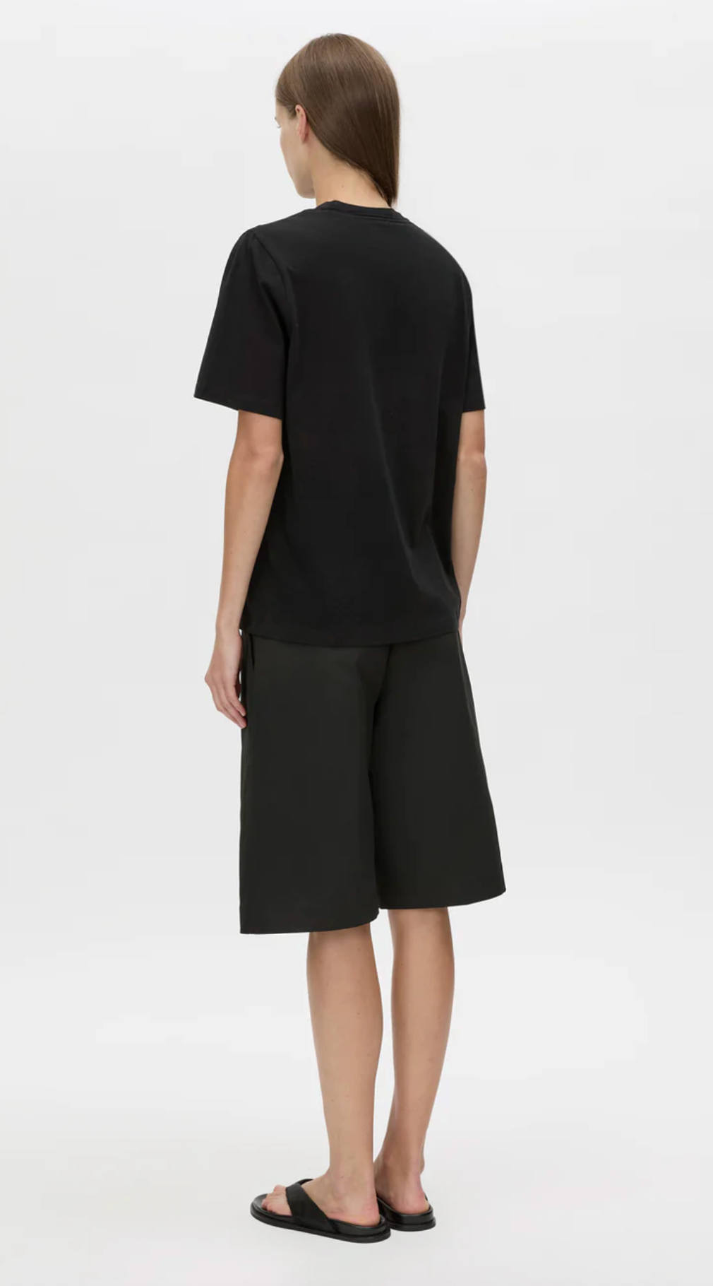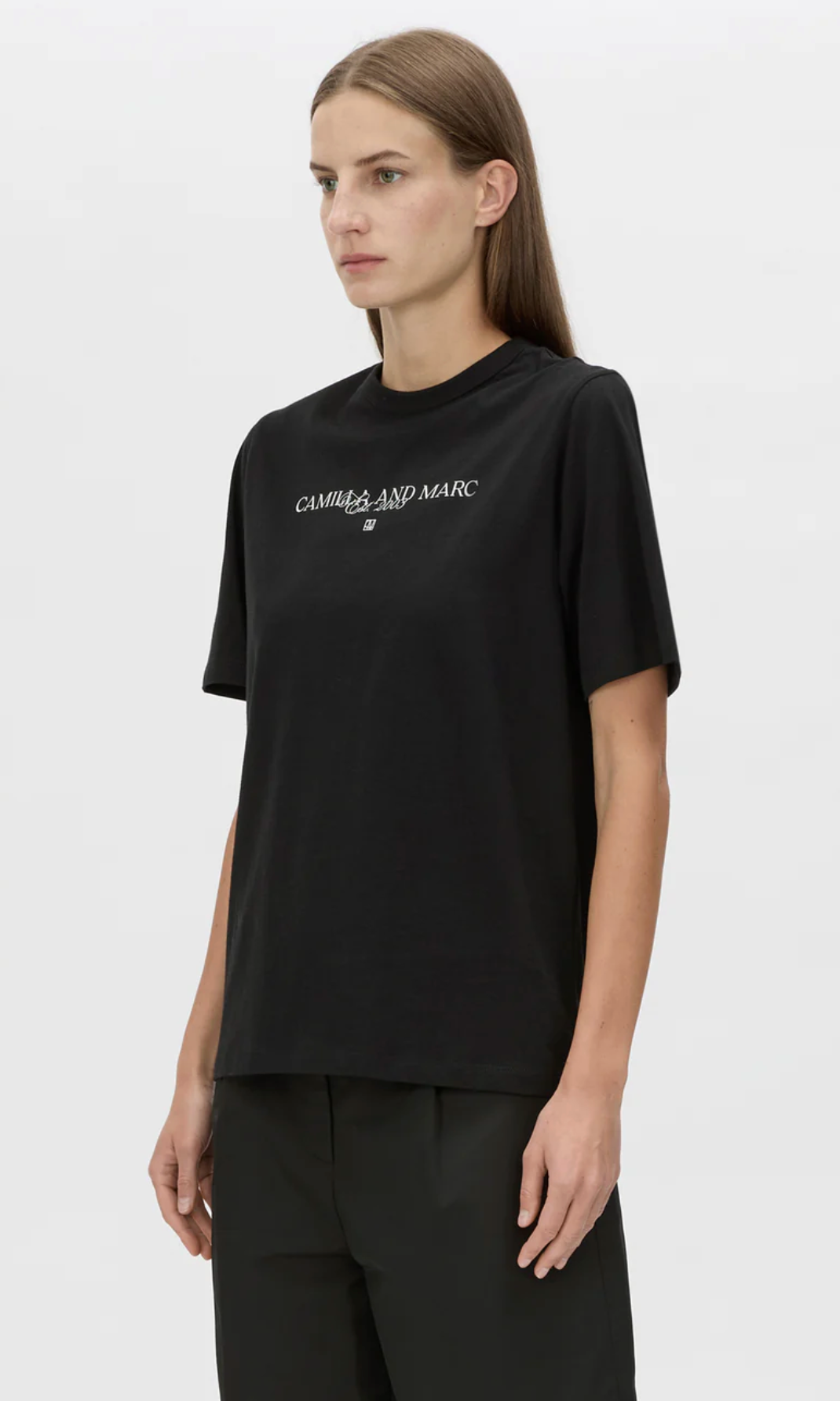 CAMILLA AND MARC Ghiberti black relaxed short-sleeve t-shirt with ribbed crew neckline and light plastisol logo print. Twin needle hem. Atelier Notes: 100% cotton. - True to size- Model is...