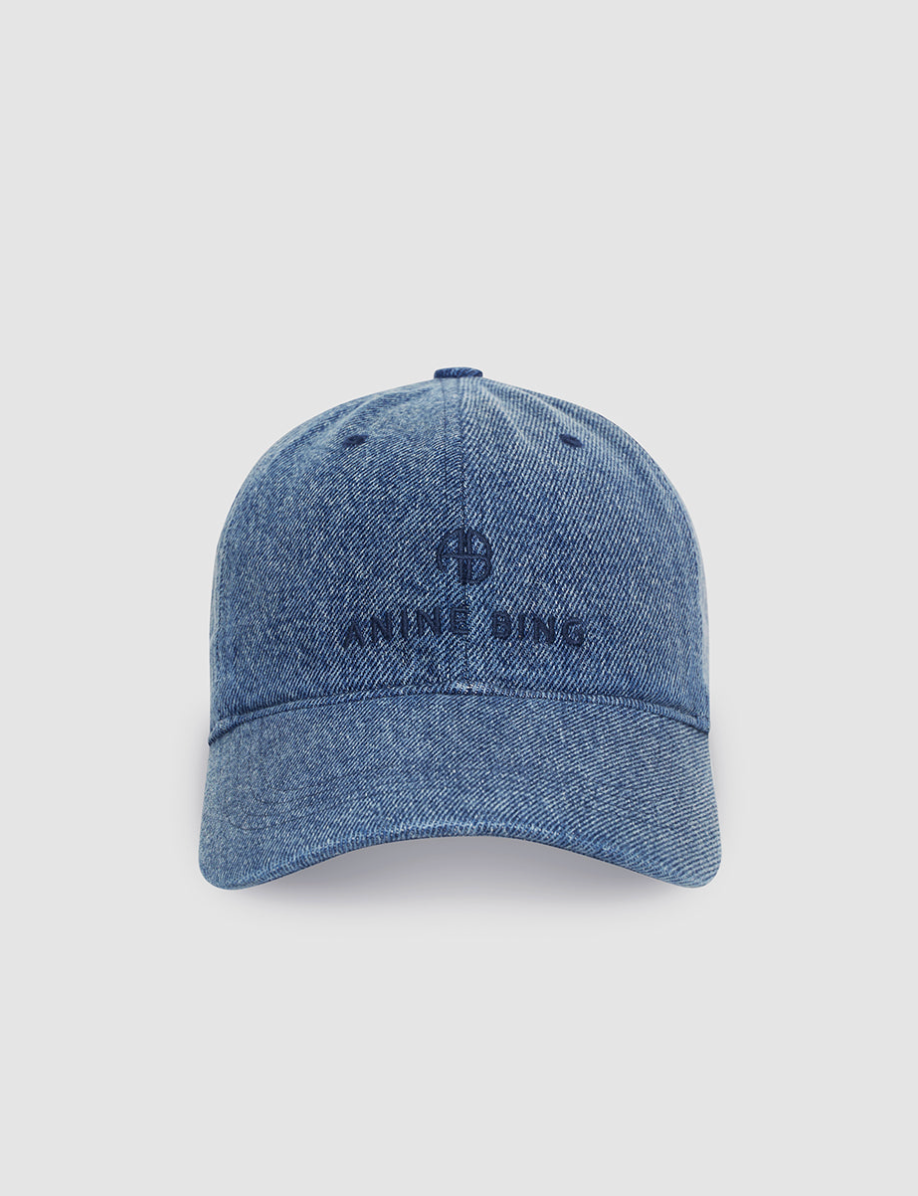 An everyday denim cap with white contrast stitching and embroidered ANINE BING logo at front. - Cotton Denim- One size- Adjustable back strap- White embroidered logo Please note: This item is...