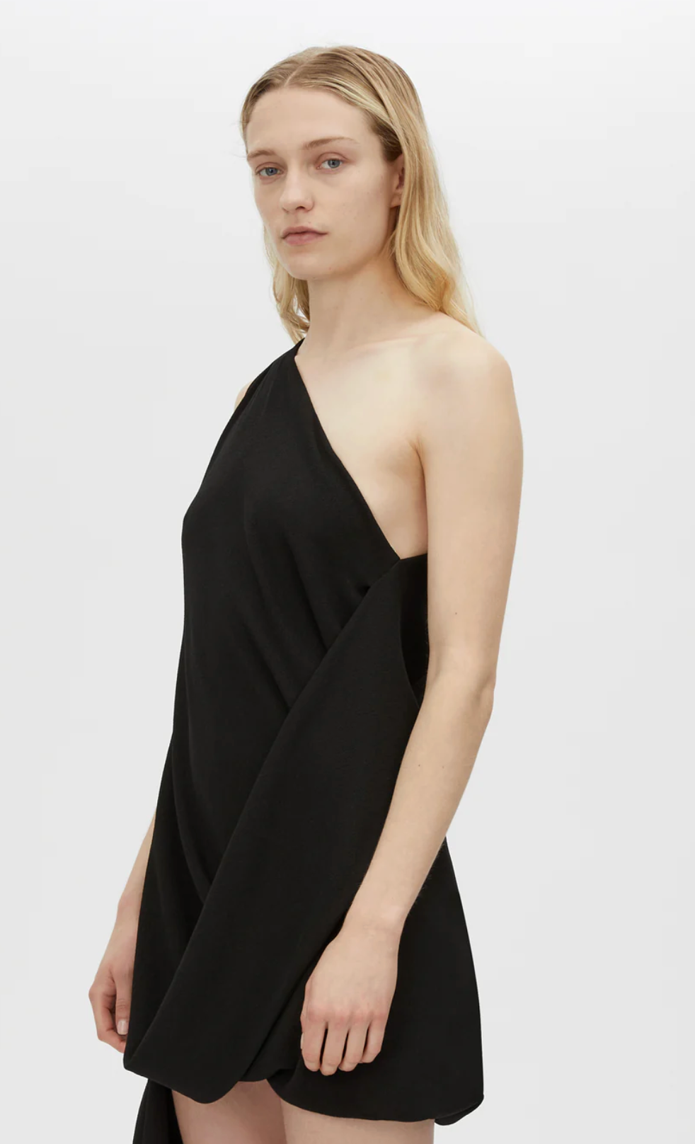 CAMILLA AND MARC Eon asymmetric draped one-shoulder mini dress in black. Invisible zip closure, fully lined, internal waistband. Atelier Notes: Korean technical 100% recycled polyester. - True to size- Model...