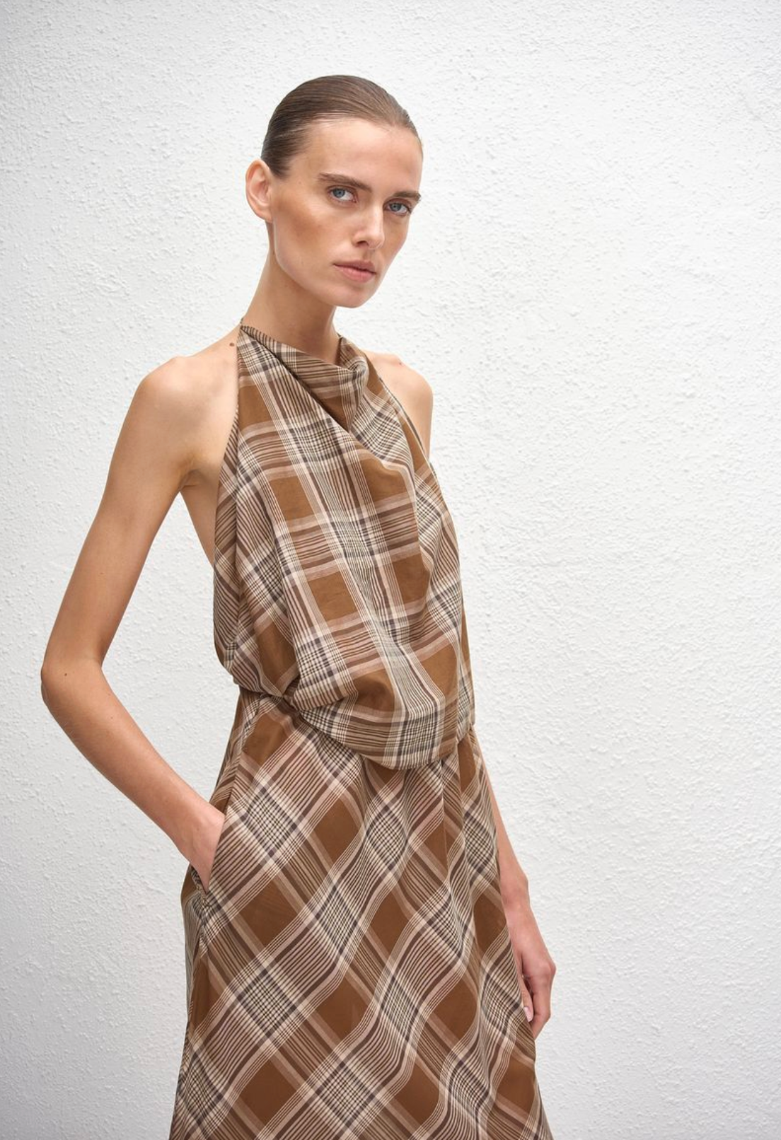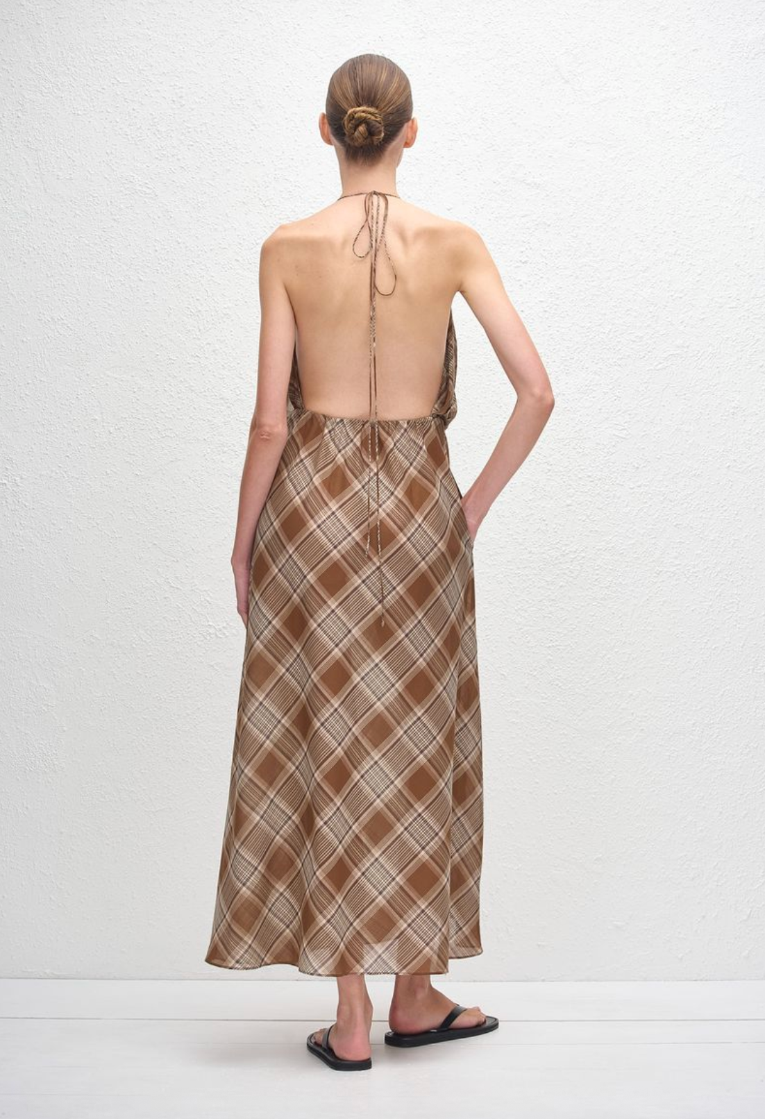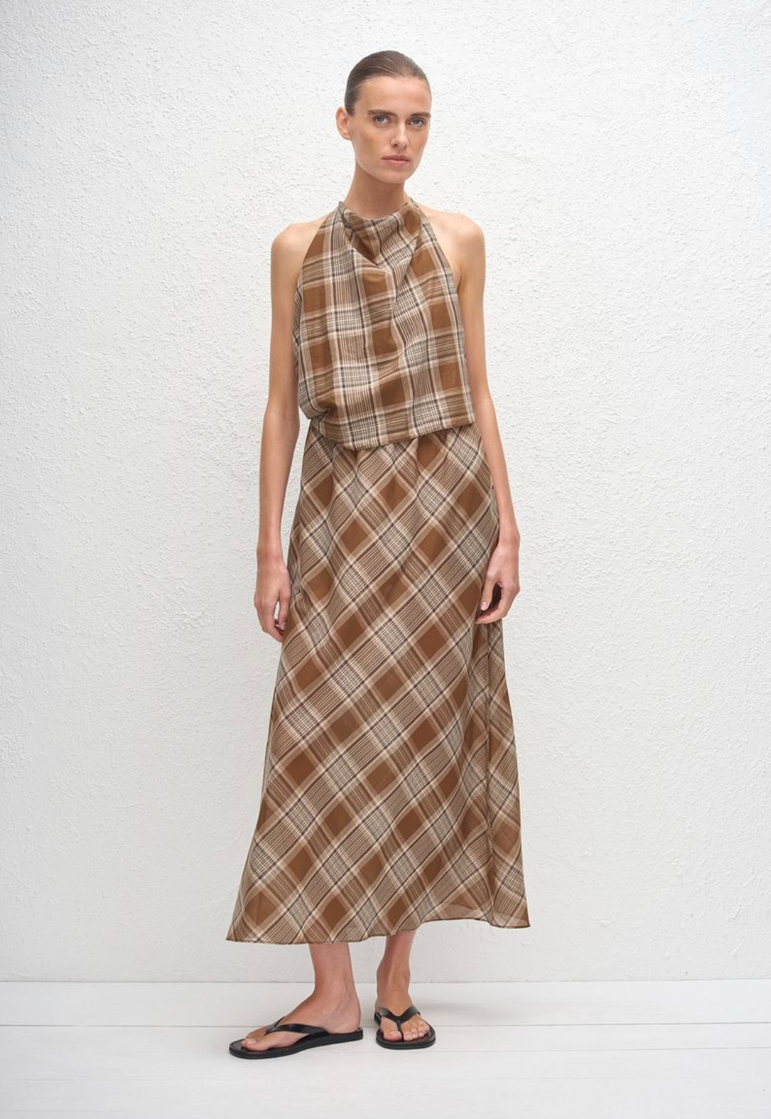 Introducing the Layered Halter Midi Dress in Picnic Plaid. This backless, halter style features a layered design, with a fitted bodice and a loose overlay to create dimension. Crafted in...