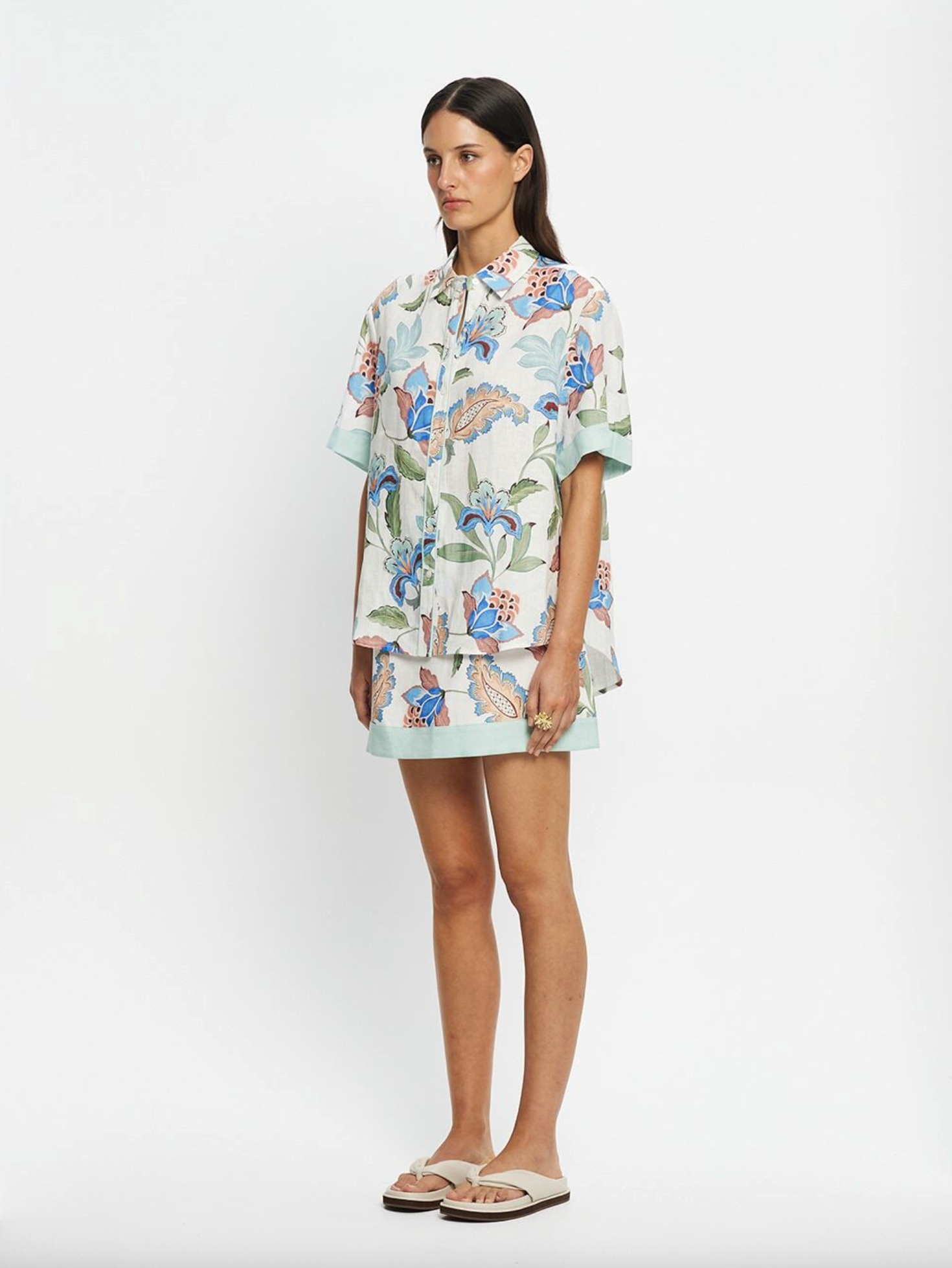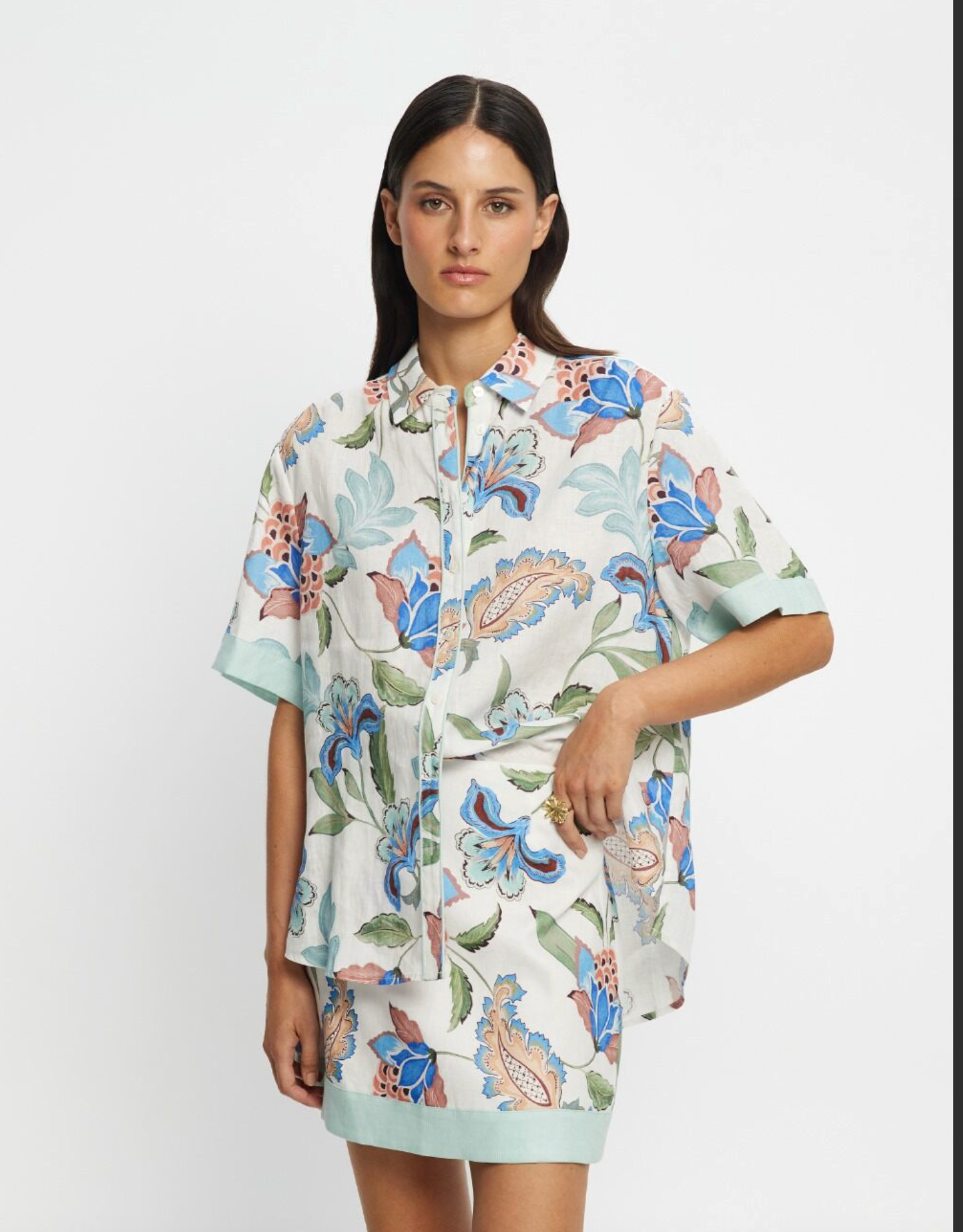 Azure is a hand painted design and is a bold floral print with blue blooms, terracotta accents, and green leaves on a white base. The Azure Shirt is a relaxed...