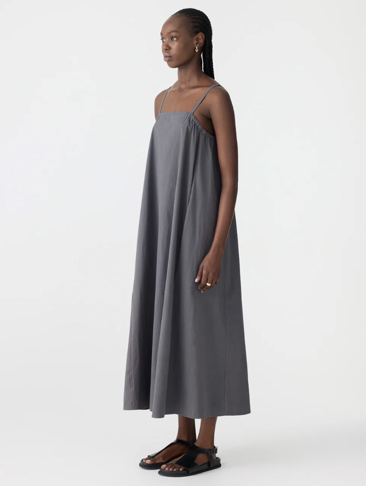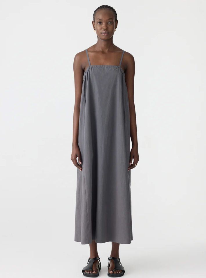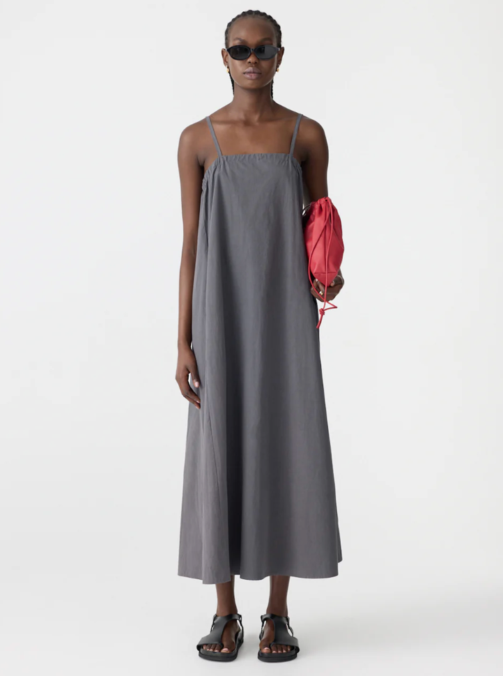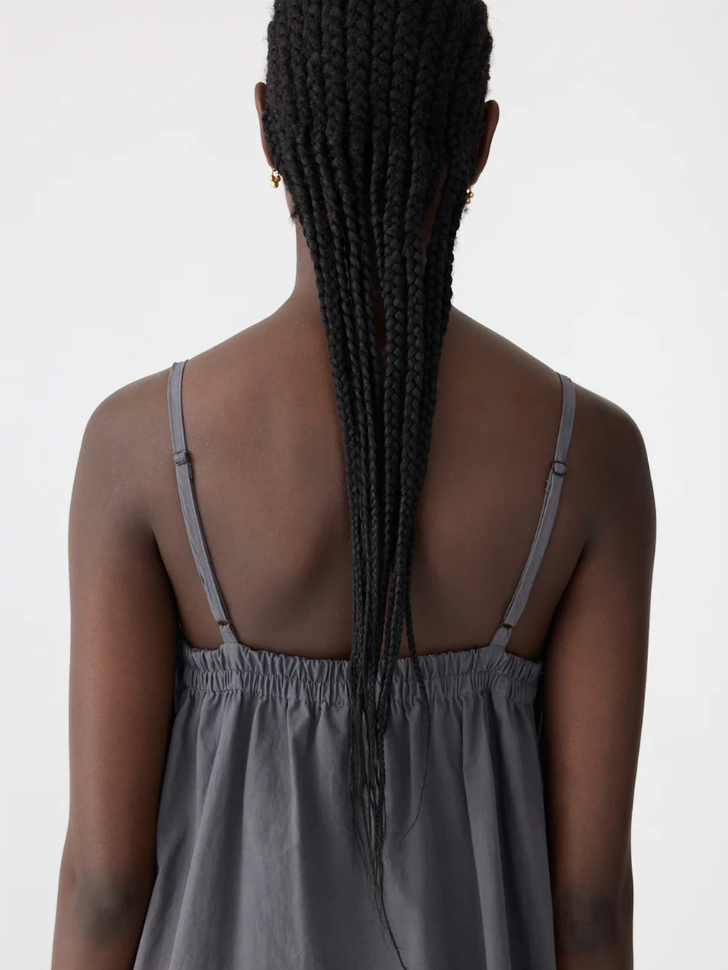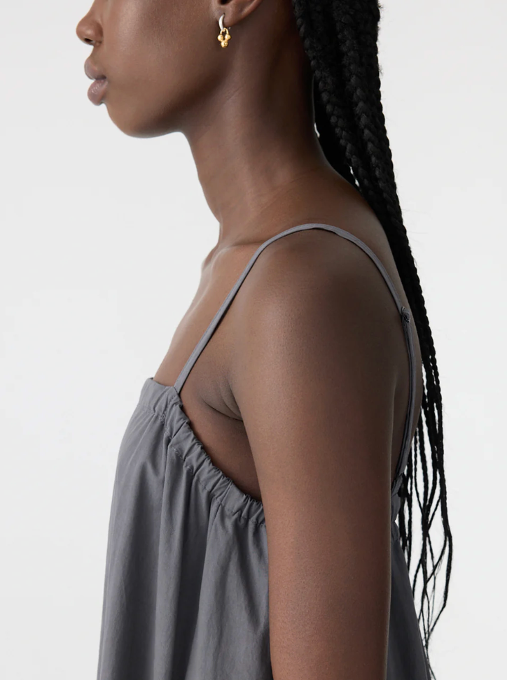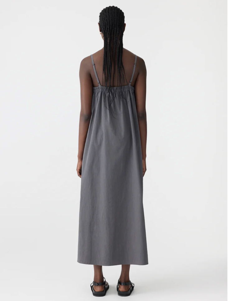 Crushed Cotton Parachute Dress crafted from lightweight crushed cotton. Designed with fine adjustable straps and an elasticated bust for ease and comfort. Finished with side entry pockets for a relaxed, functional silhouette.