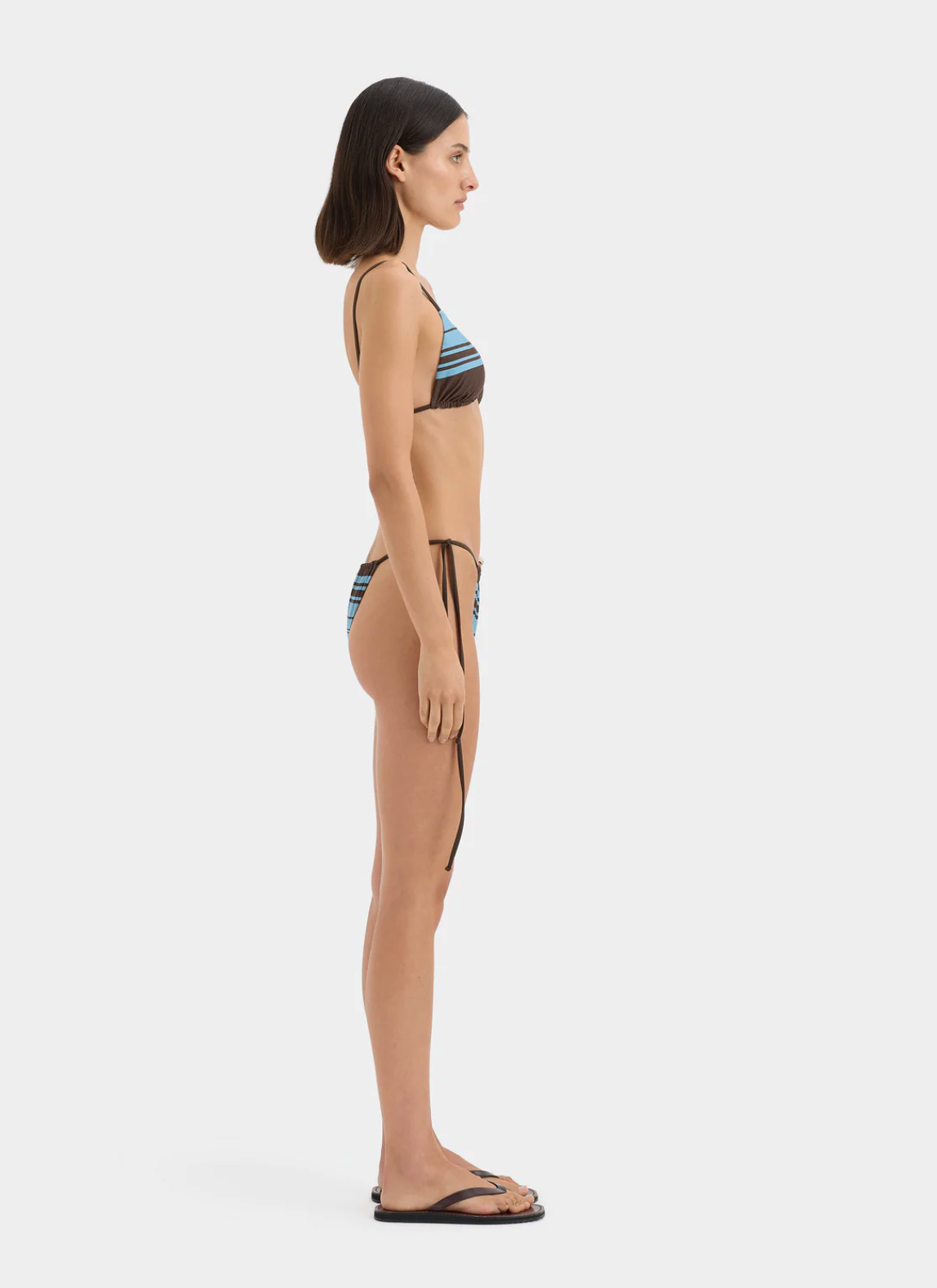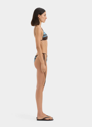 COMING SOON - The Rioja String Brief is crafted from form-fitting lycra in an exclusive geometric stripe print. Designed to sit low-rise and high-cut, it features a single self tie and a cluster of beads on the left hip.