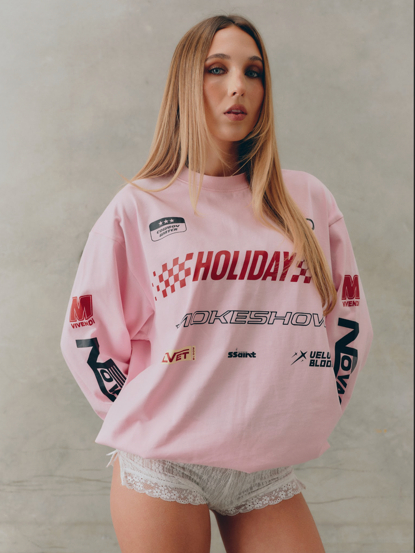 Race-inspired and made to stand out. This oversized long sleeve pairs bold graphics with premium cotton comfort. Each colourway—pink, black, and white—features its own unique artwork, unified by the names of our signature fragrances. Designed as a unisex essential, it’s the perfect balance of comfort, edge, and everyday wear.