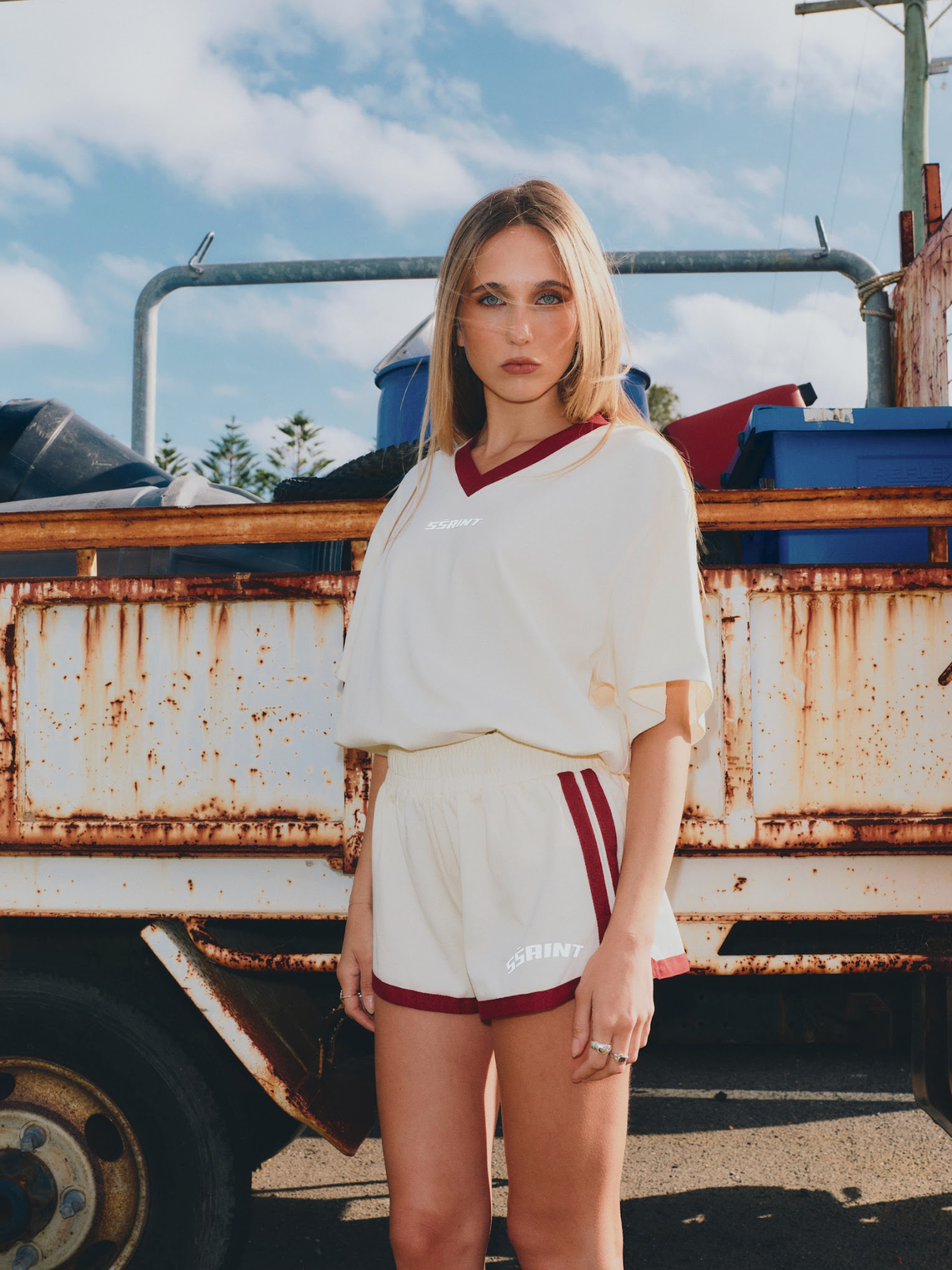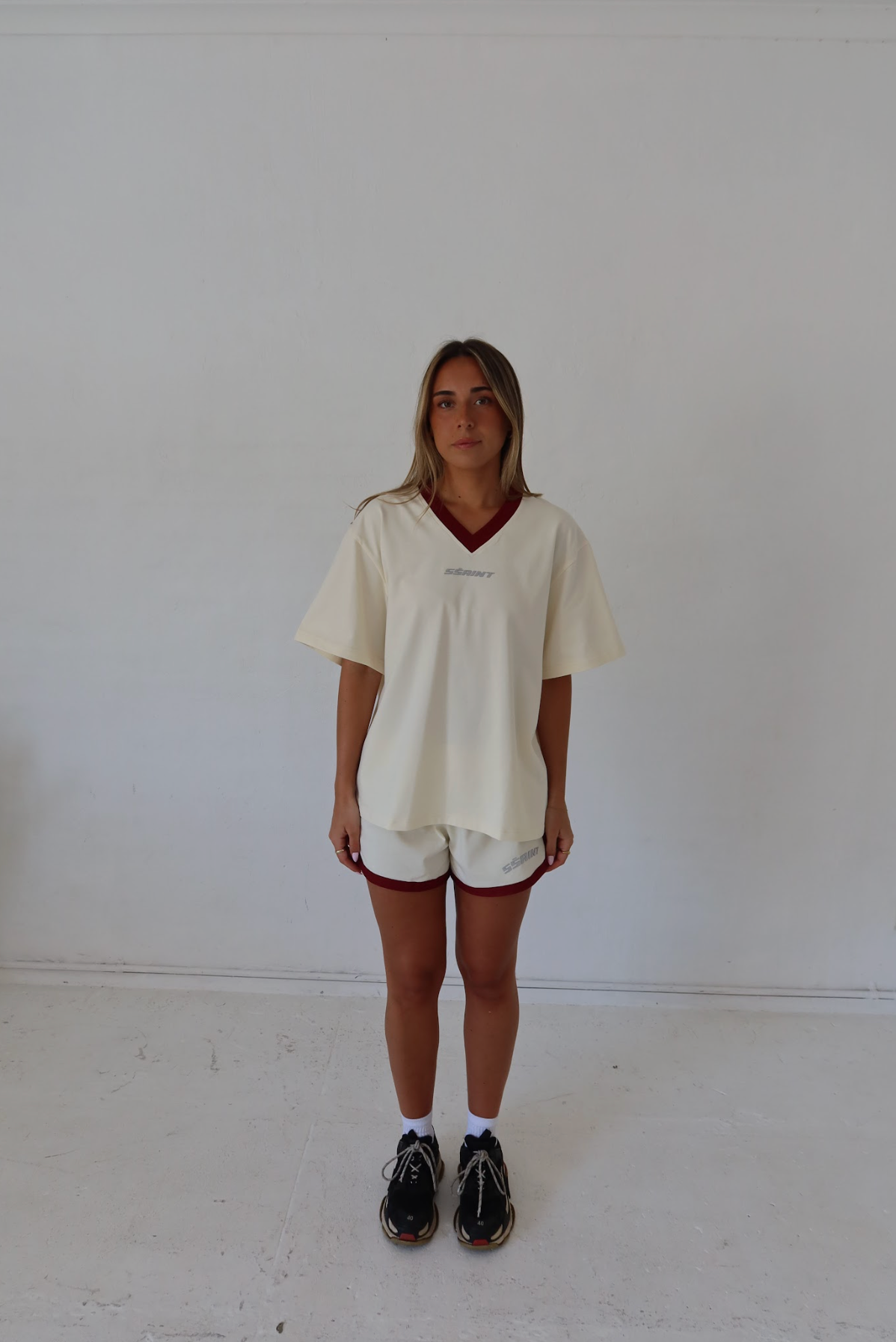 Cut with a clean V-neckline and contrast collar, this long sleeve tee is a nod to classic sportswear with a modern edge. Finished with the SŚAINT silver reflective logo, it’s equal parts statement and staple.