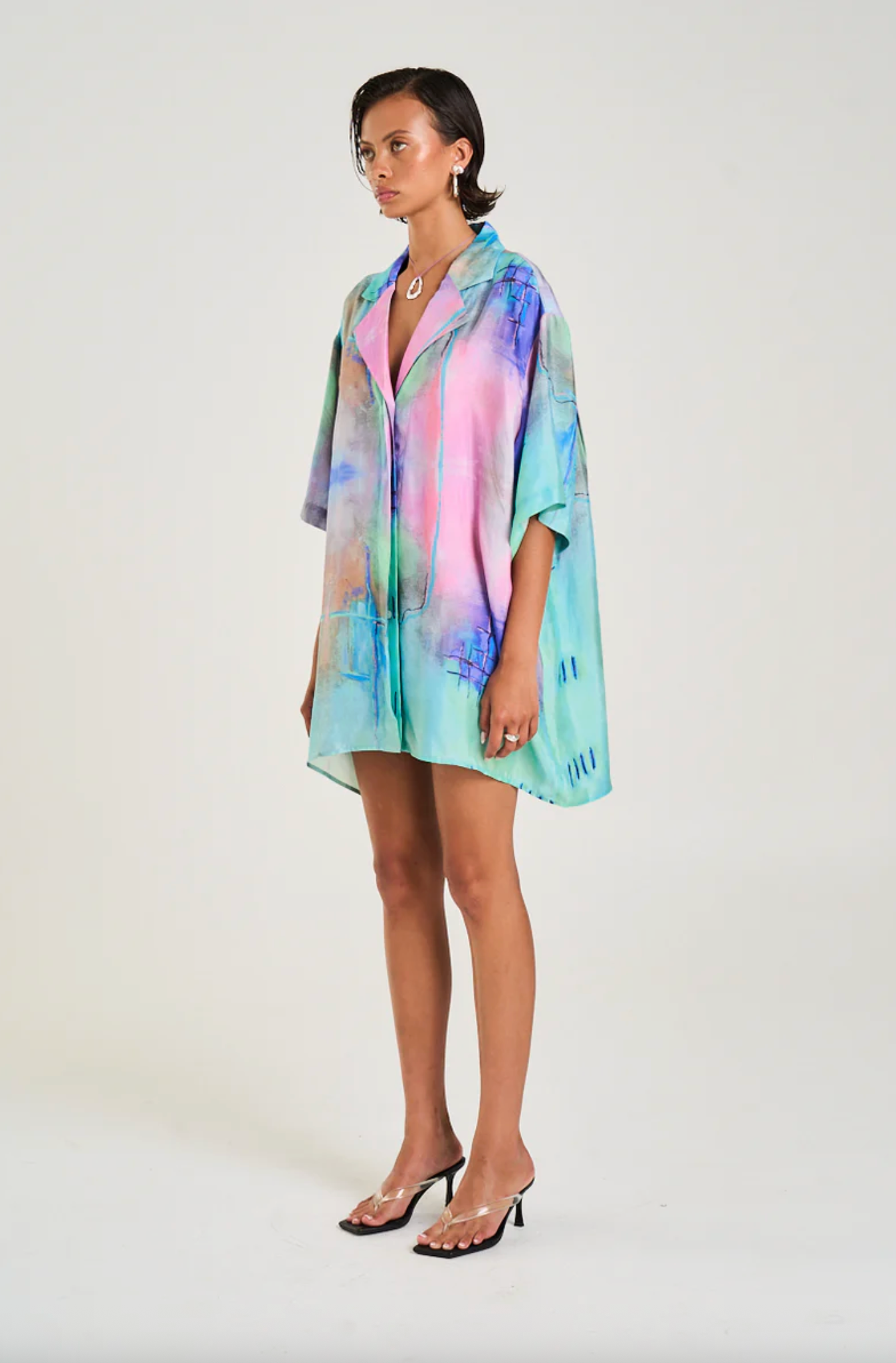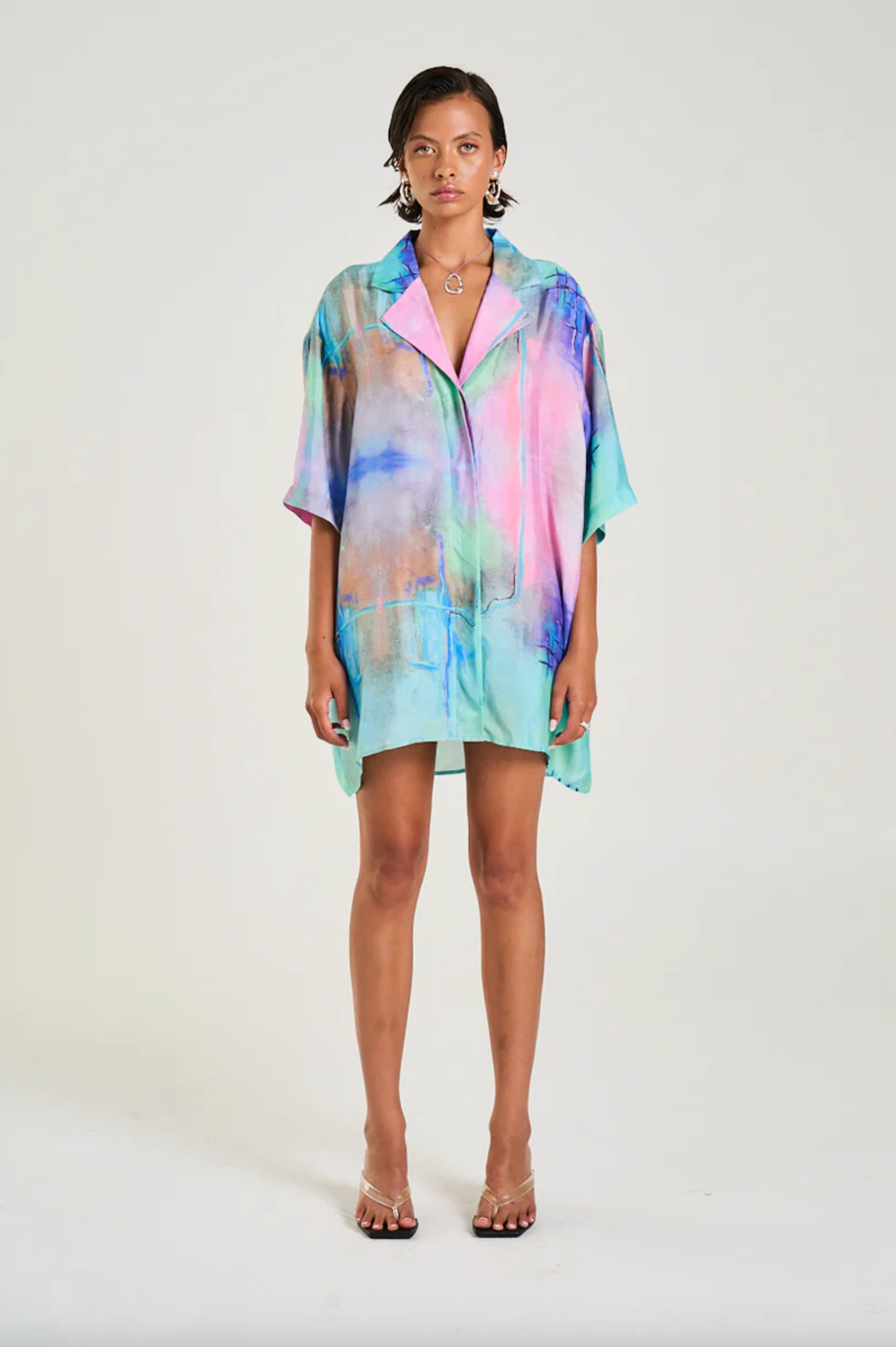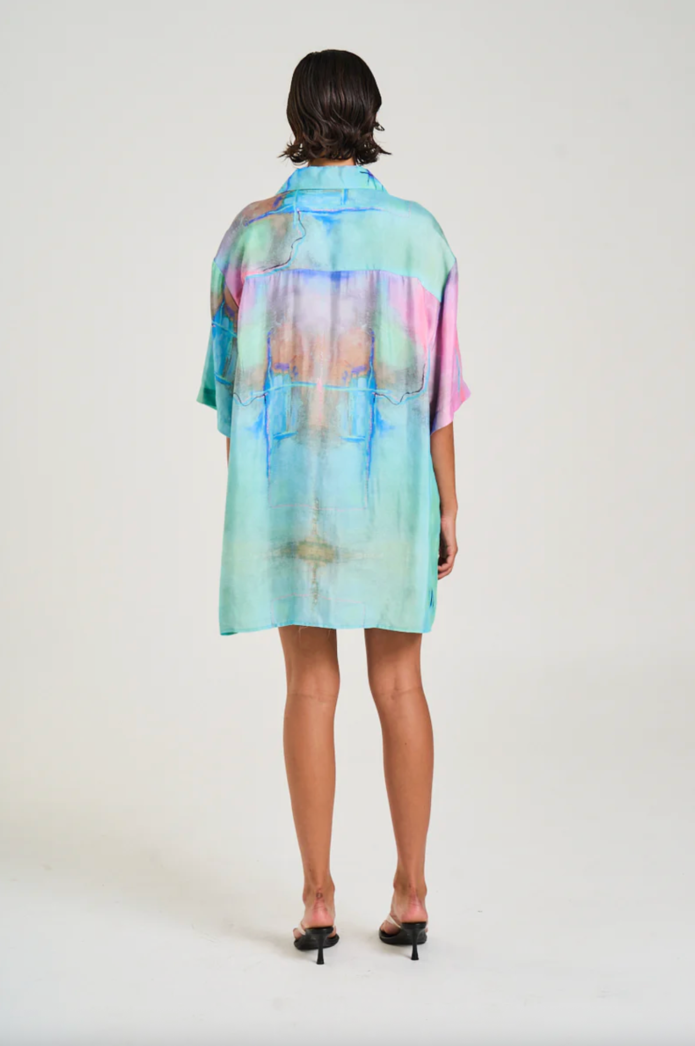 Expertly crafted for versatility, the Luka Shirt Dress effortlessly showcases the H20 print in soft pastel hues, completed with a bold oversized collar. With concealed buttons and extended length, this versatile piece can be worn as either a shirt or dress, providing an elevated look.