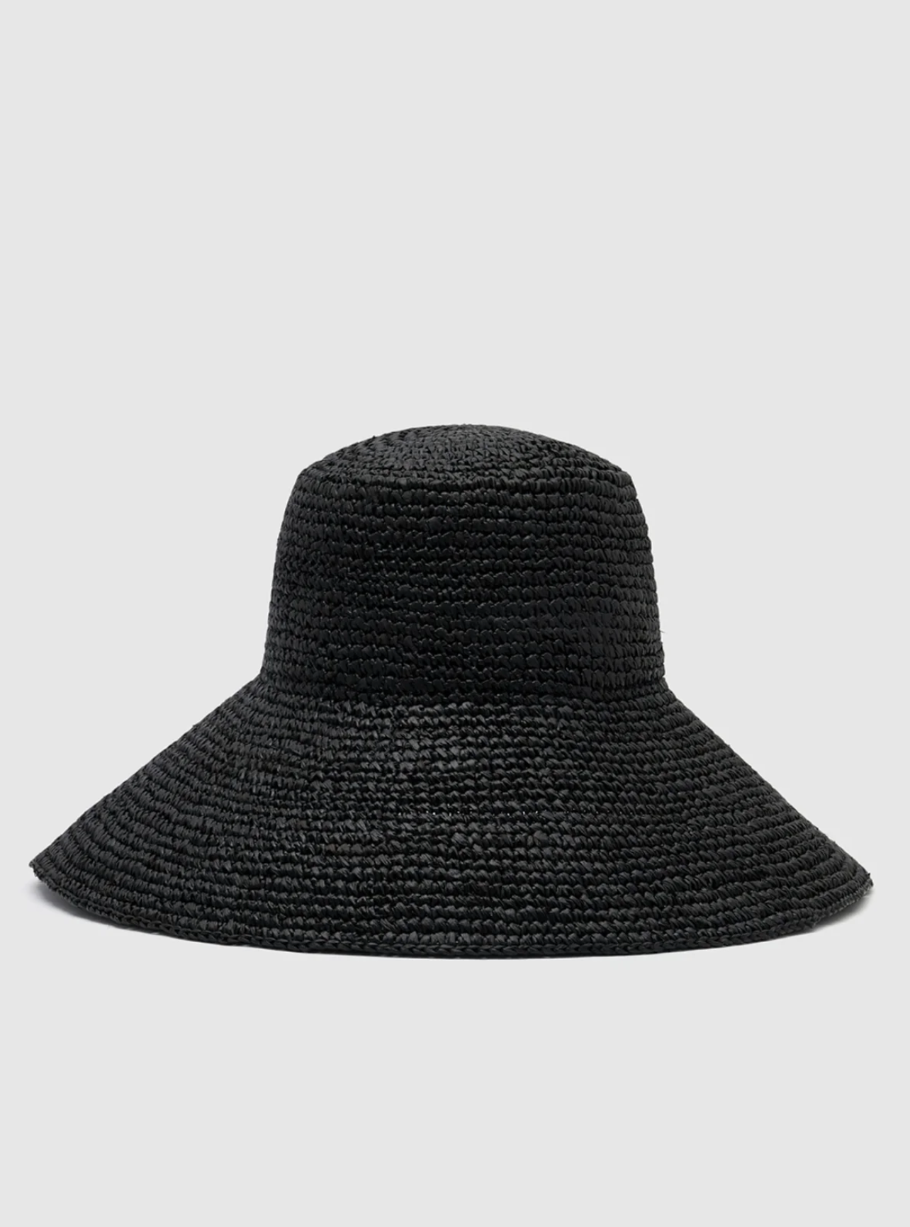 CAMILLA AND MARC Oasis woven wide brim straw hat in black raffia. Monogram logo at centre back. 100% Straw - One size fits all- Model is 180cm tall and wearing...