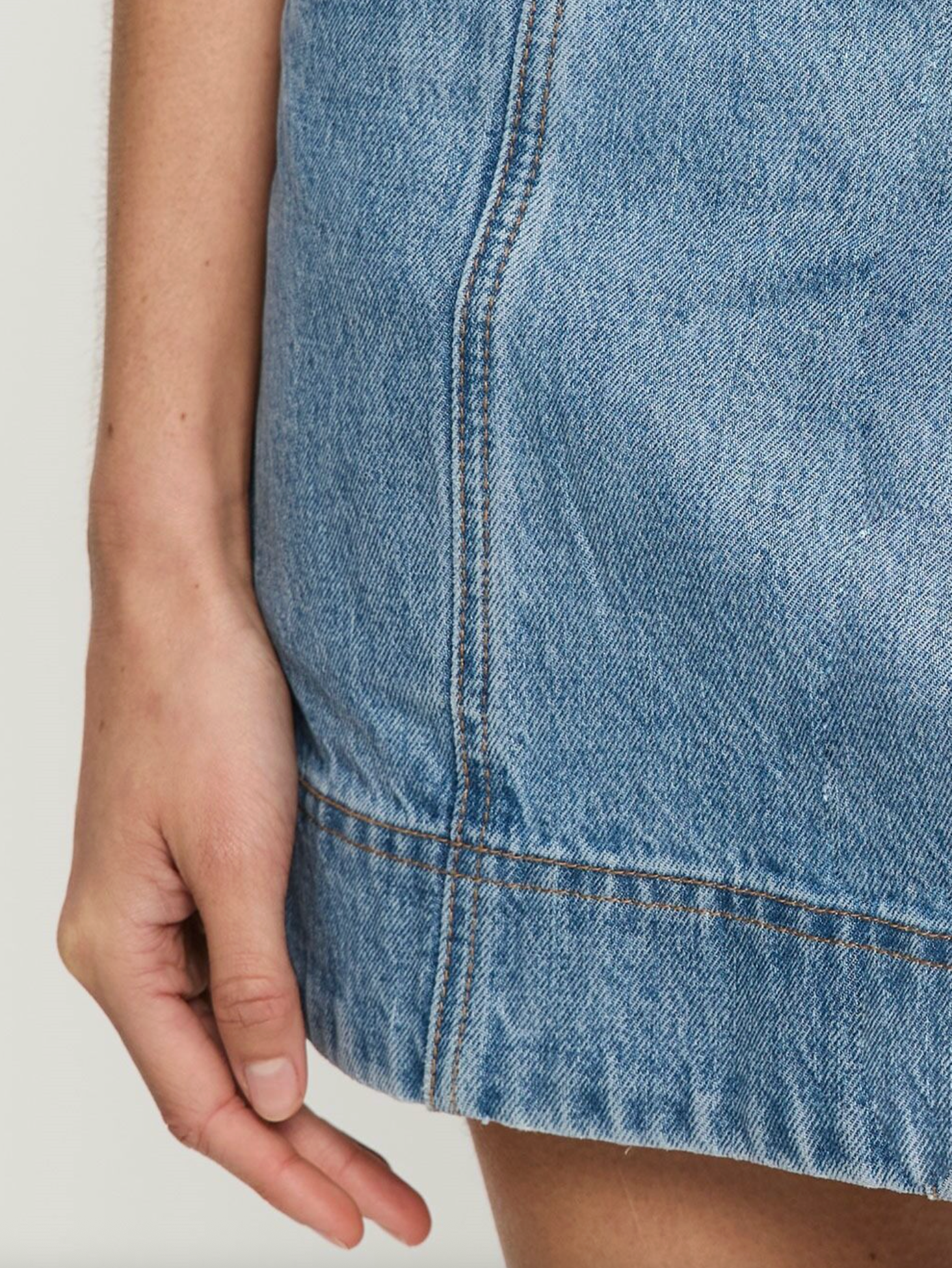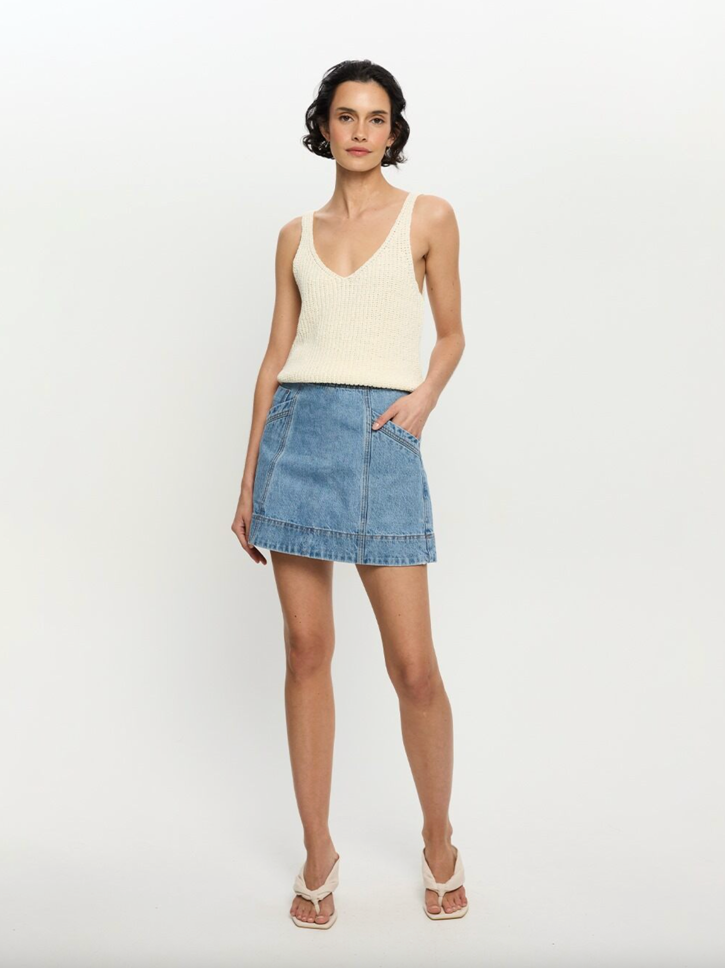 The Alba Denim Mini Skirt is an A-line mini skirt featuring angled pockets at front, an exposed centre back zip complete with a signature leather tab at back waistband.