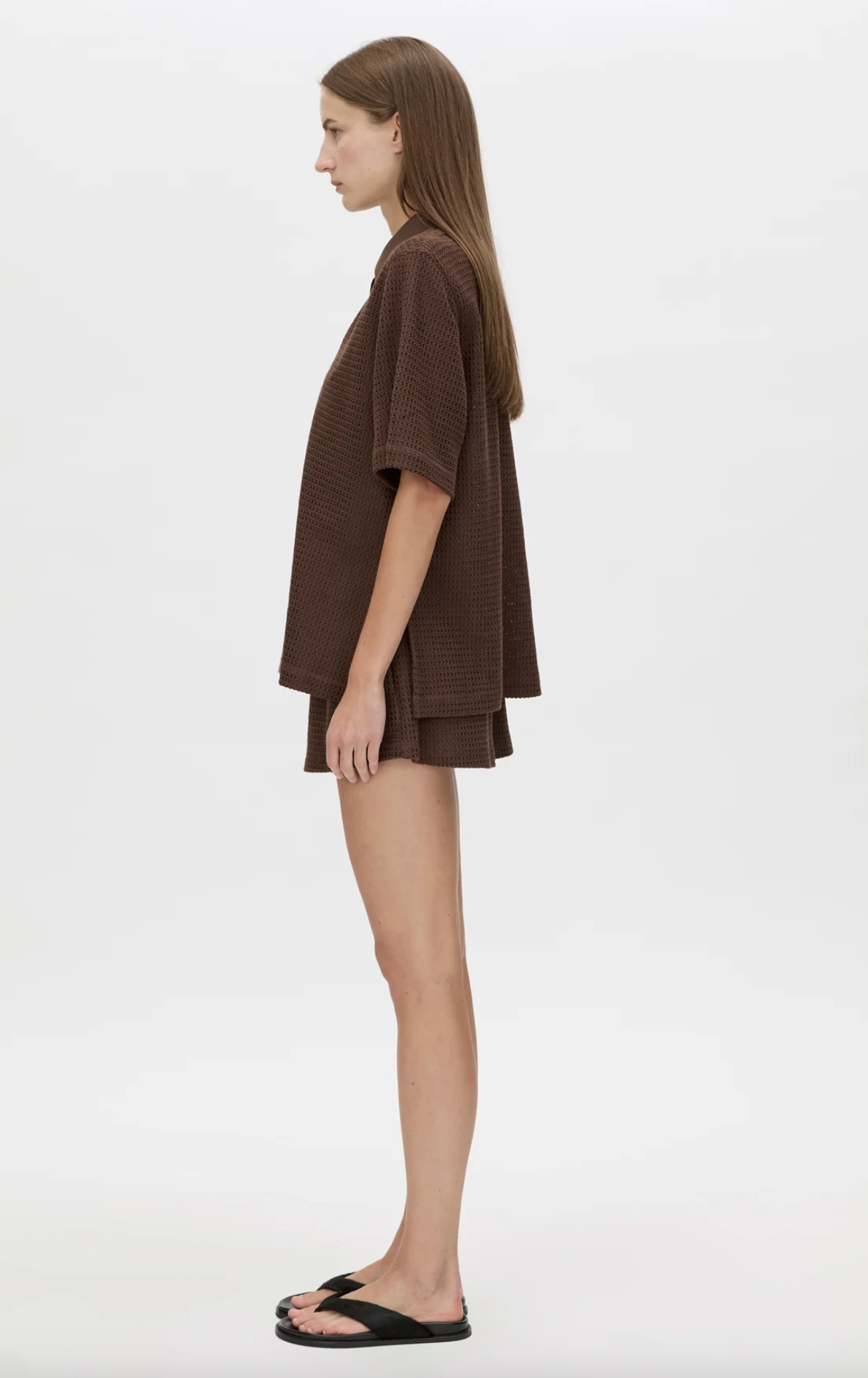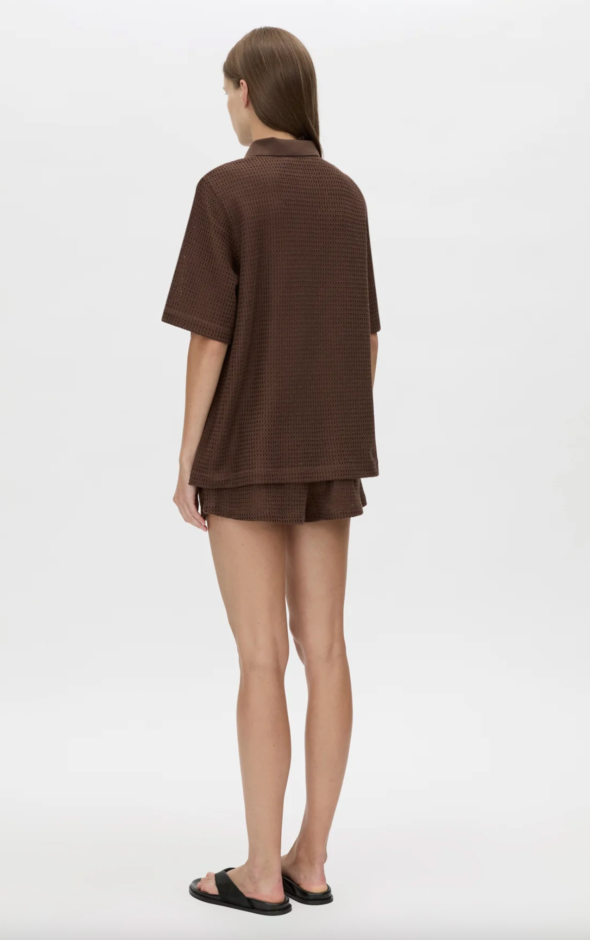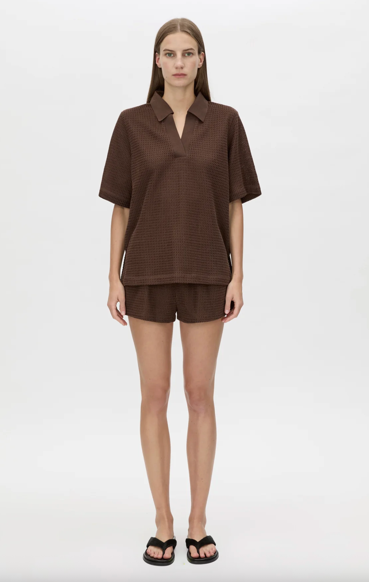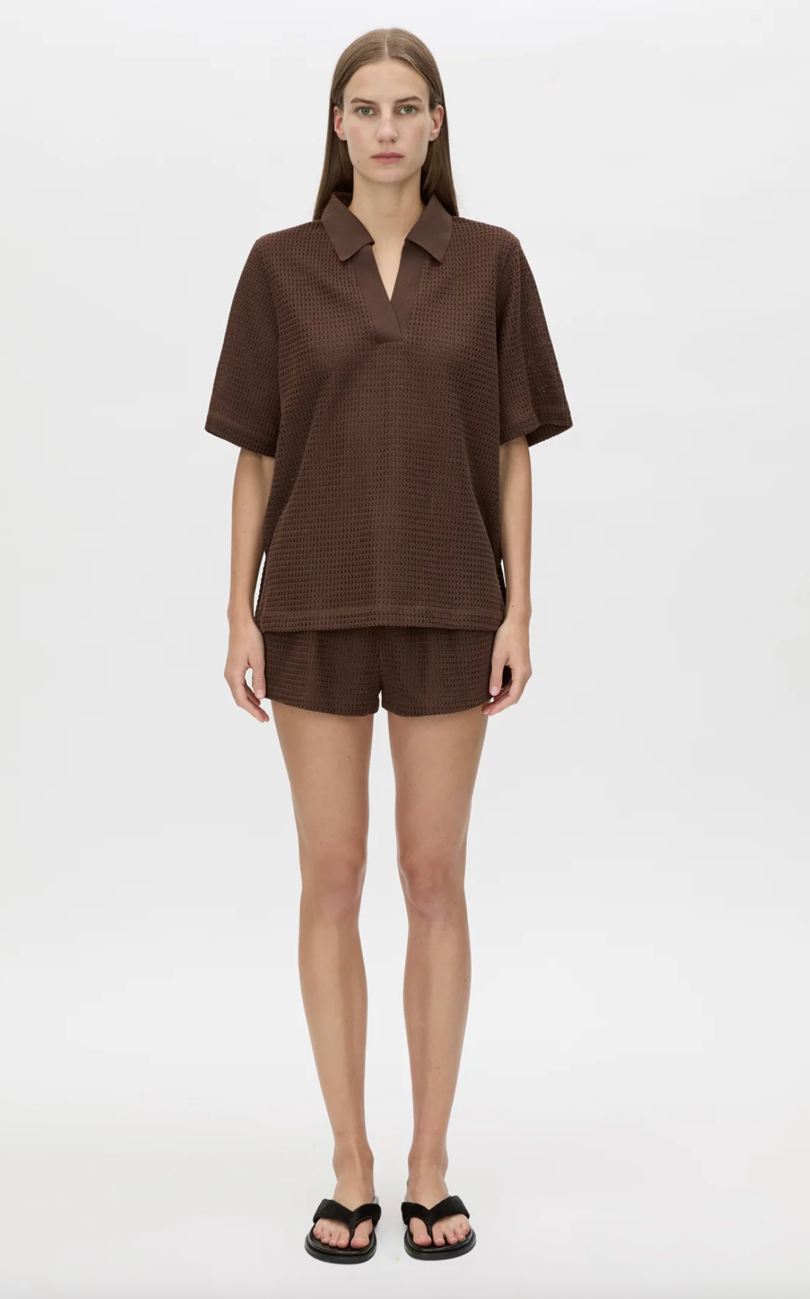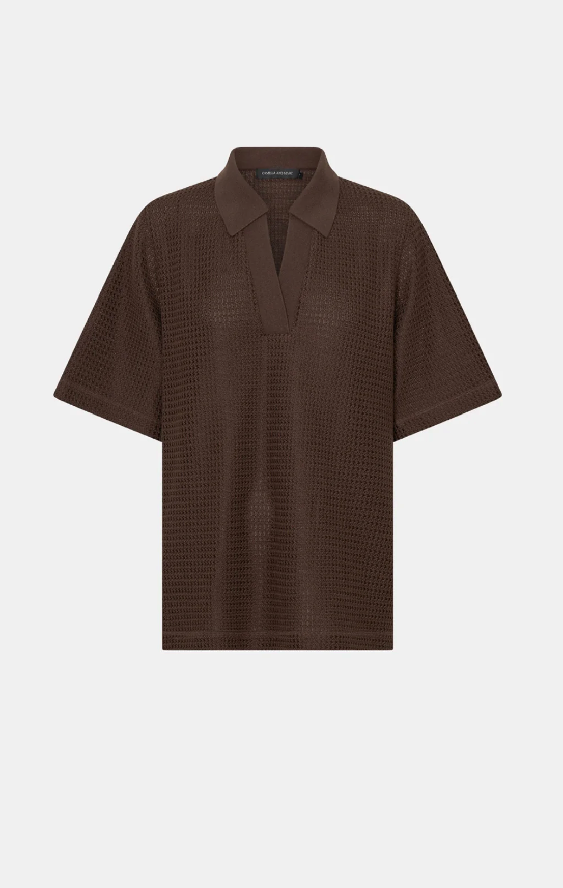 CAMILLA AND MARC Turrell oversized textured tee in chocolate with trophy rib collar. Wide short sleeves, side splits. - Oversized Fit- Model is 184cm tall and wearing a size 8-...
