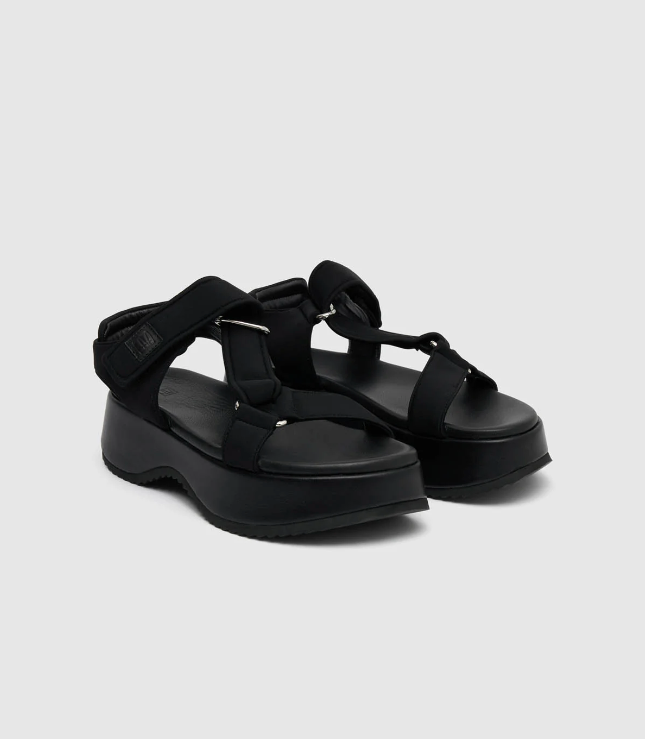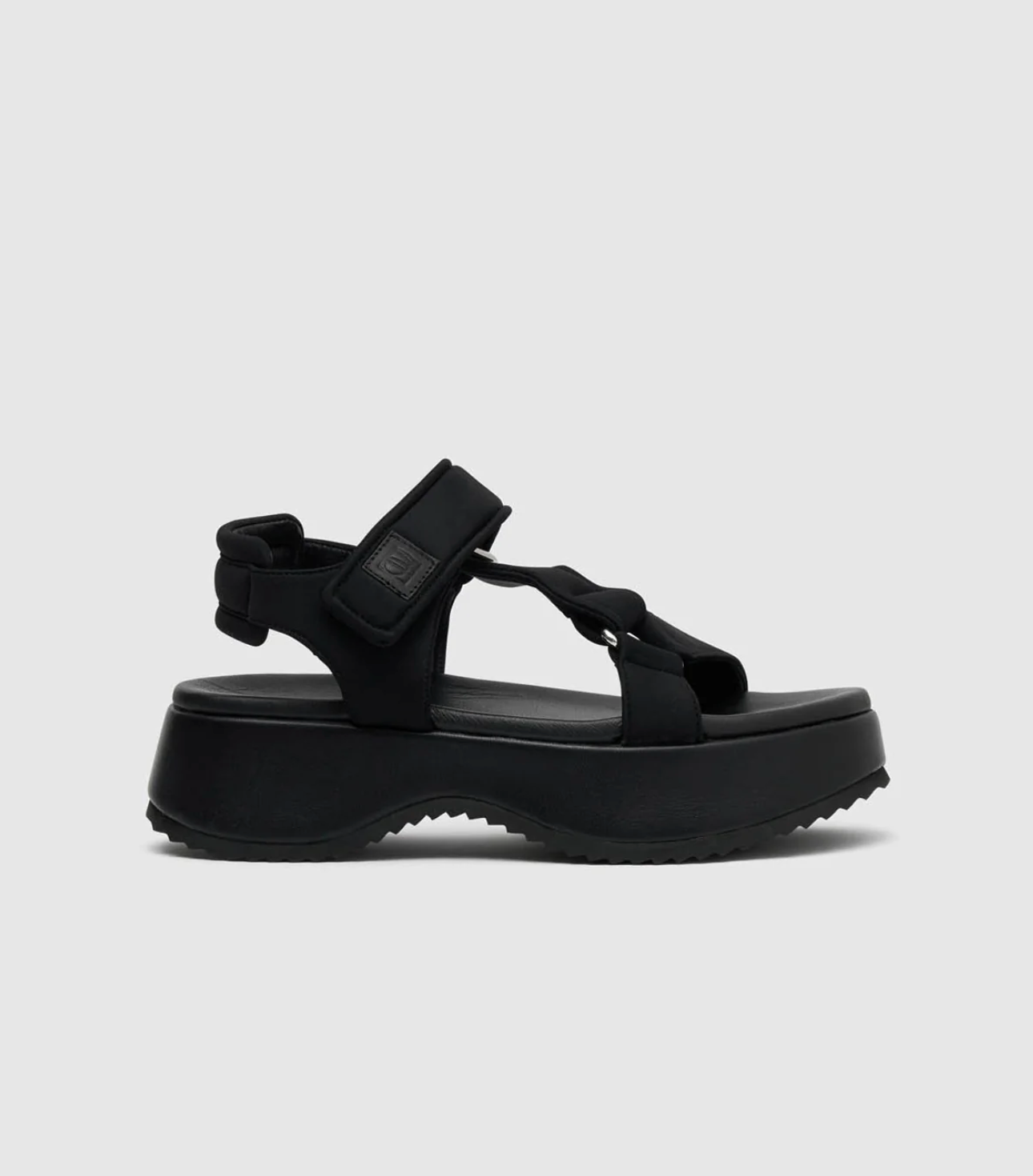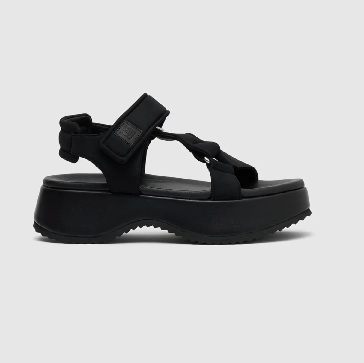 CAMILLA AND MARC Romy black platform hiking sandal. Padded neoprene straps, logo detail, Italian leather covered platform, 45mm waved platform sole Made in Italy. Atelier Notes: Made in Italy. -True...