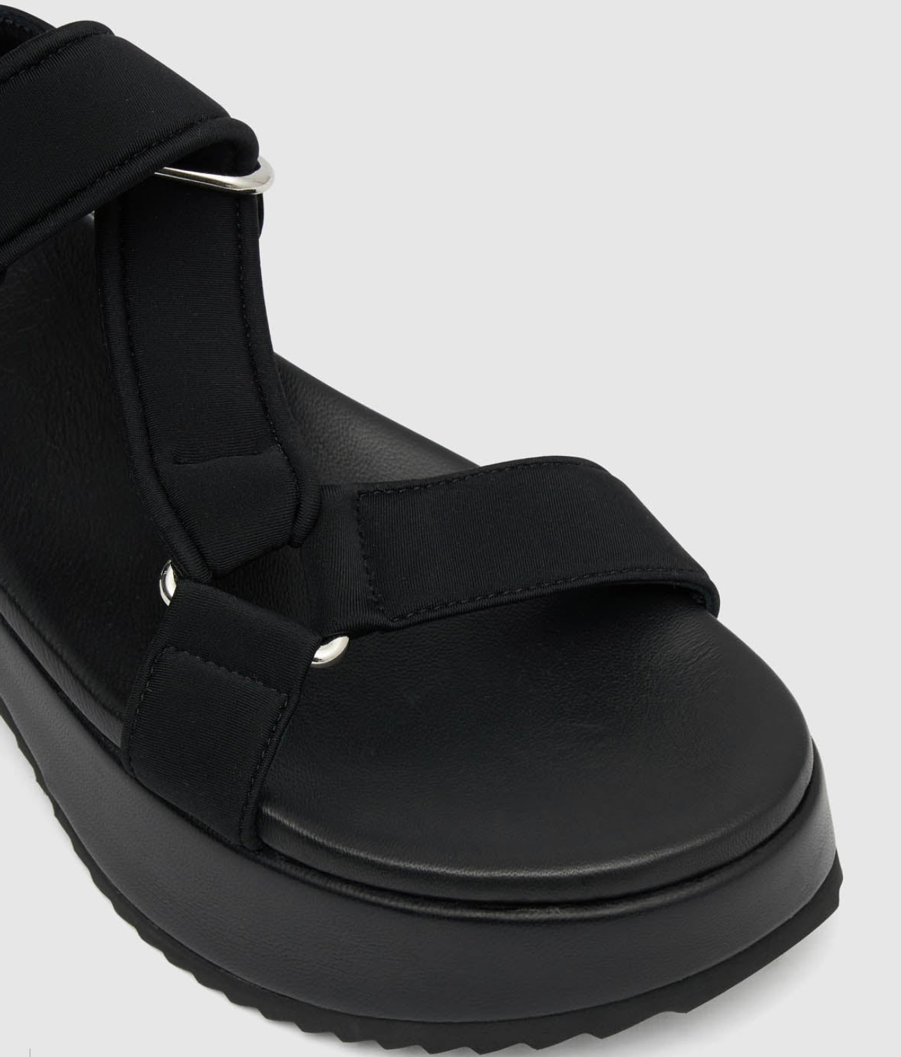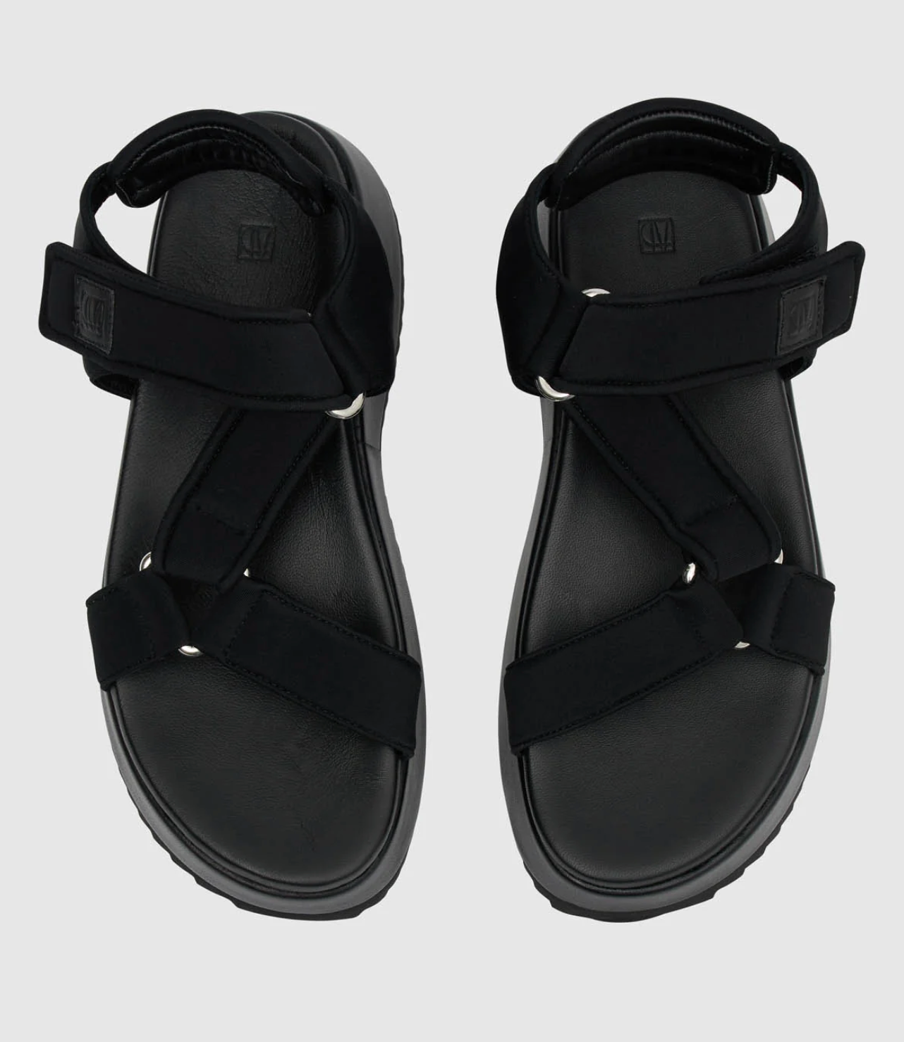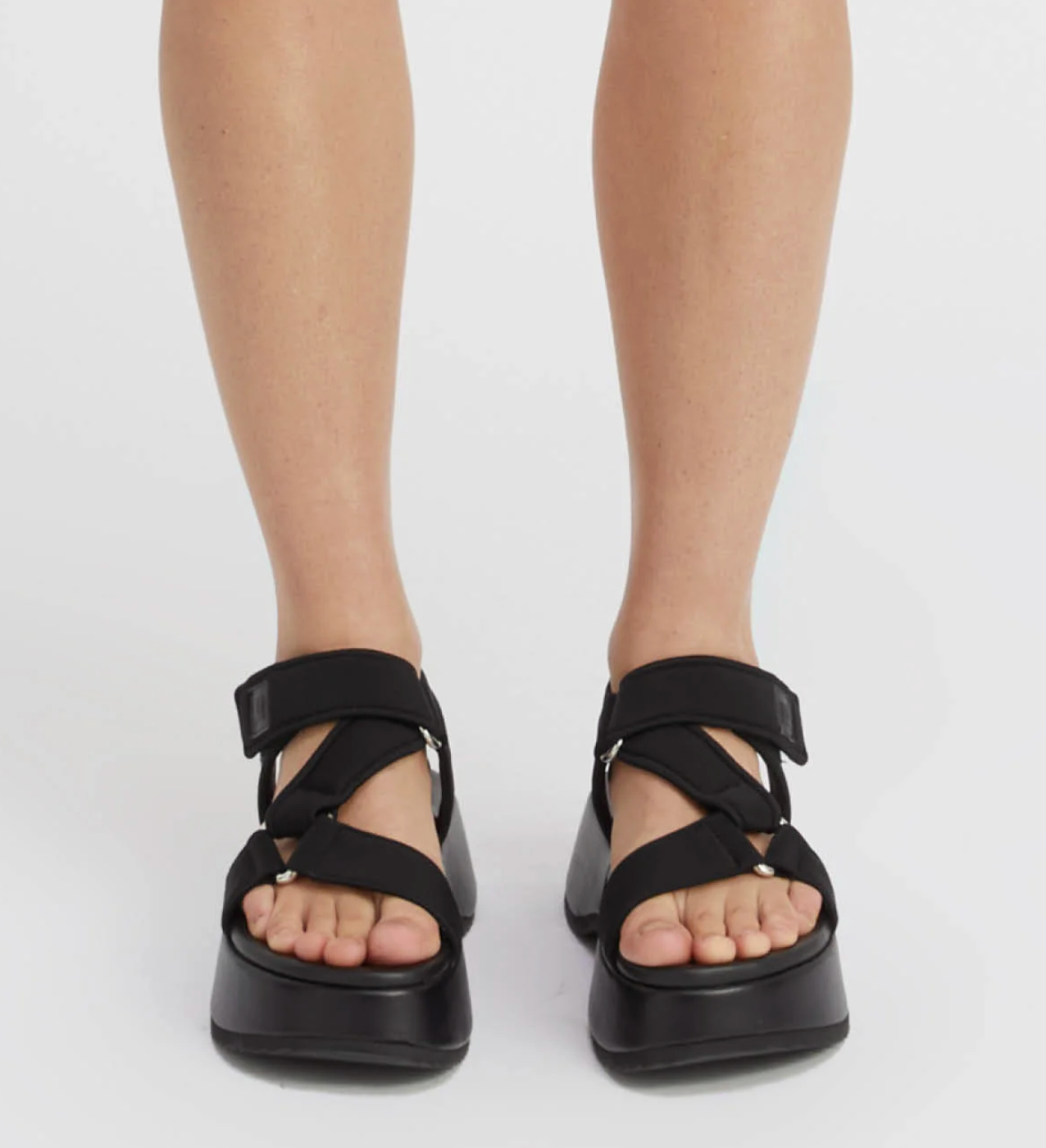 CAMILLA AND MARC Romy black platform hiking sandal. Padded neoprene straps, logo detail, Italian leather covered platform, 45mm waved platform sole Made in Italy. Atelier Notes: Made in Italy. -True...