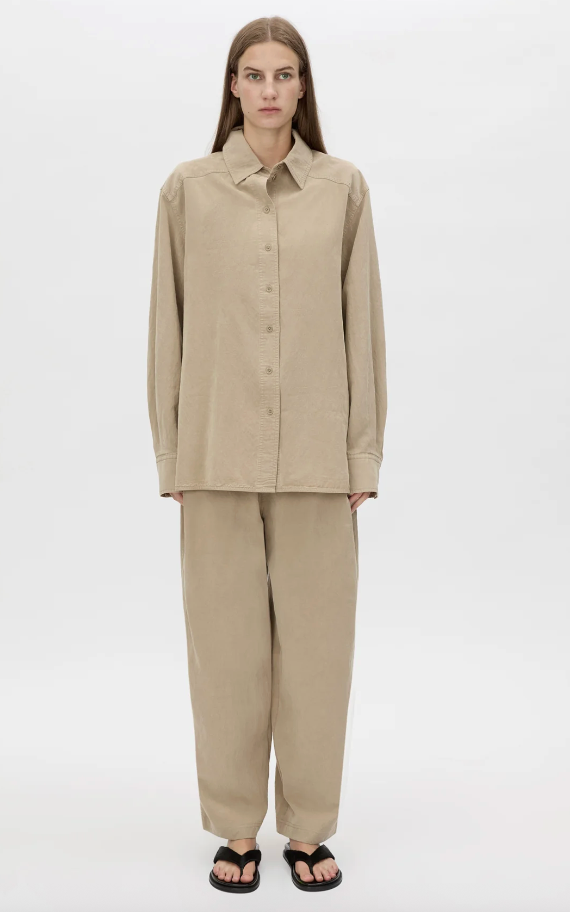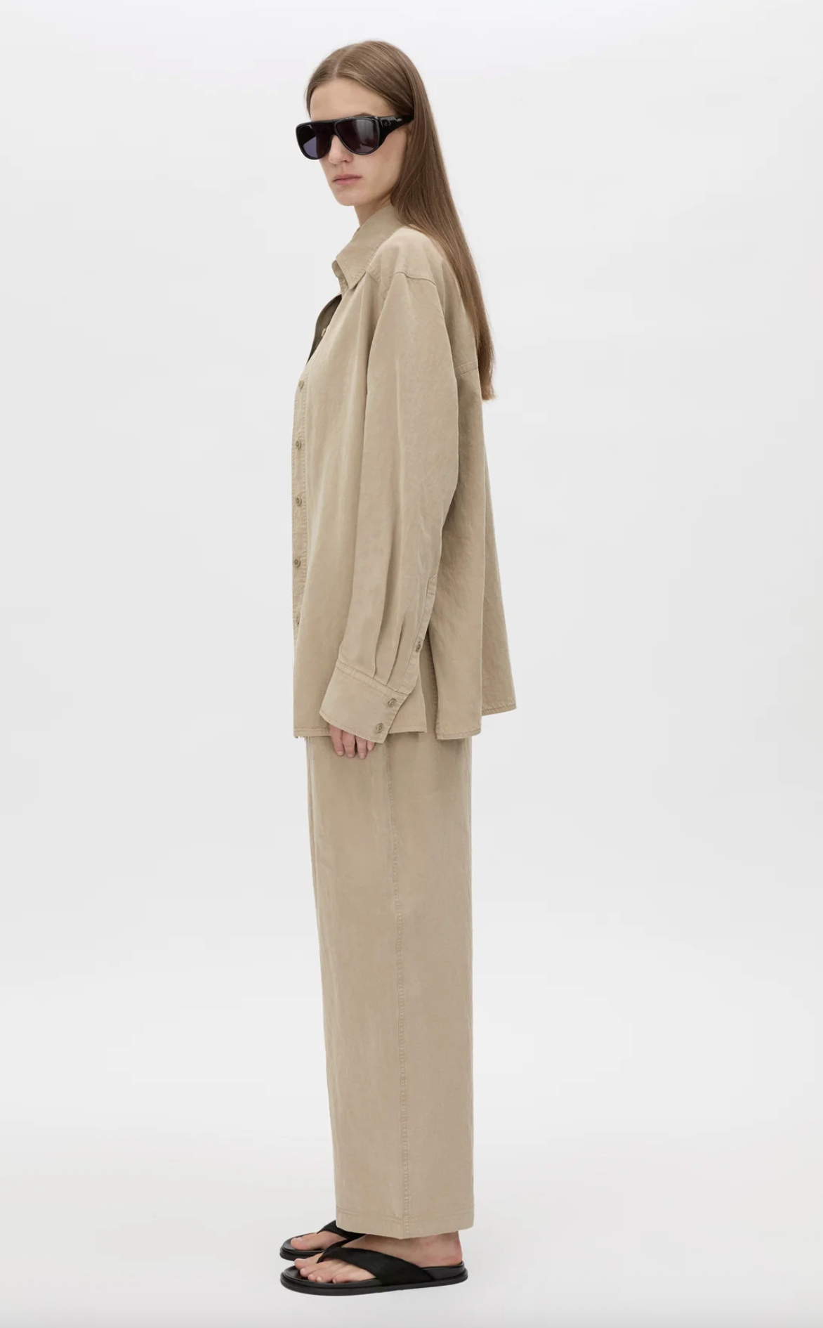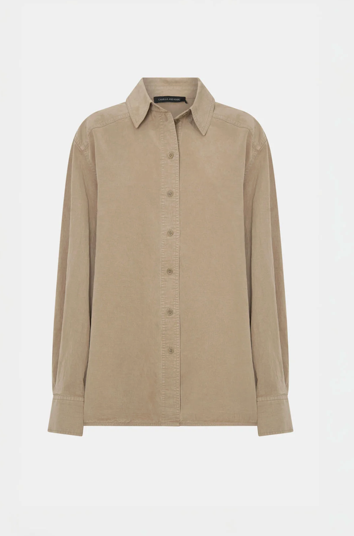 CAMILLA AND MARC Adakite collared brown oversized shirt with corozo buttons. Long sleeves, side splits, classic collar. Atelier Notes: Woven from a blend of cotton and tencel. - Oversized fit-...