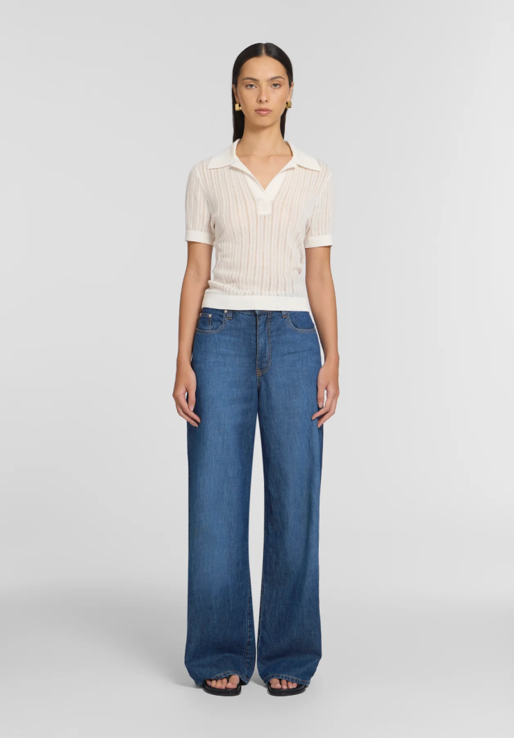 The Wisteria Polo, realised in a superfine ivory cotton and silk blend, offers understated sophistication. Knitted in a delicate herringbone-inspired pointelle stitch, this short-sleeve polo features a neat silhouette with...